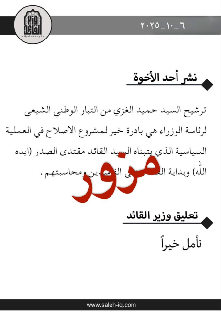 الشيعي”، مؤكدًا أن “المنشور مفبرك بالكامل ولا يعكس موقف السيد مقتدى الصدر أو