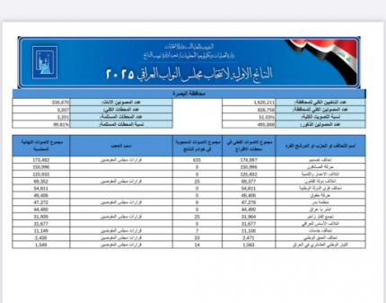 حقق تحالف تصميم المرتبة الاولى بحسب النتائج الاولية للانتخابات في البصرة ، وحركة صادقون بالمرتبة الثانية ، وائتلاف الاعمار والتنمية يحصل على المرتبة الثالثة .وبلغ عدد الناخبين الكلي في محافظة البصرة أكثر من مليون