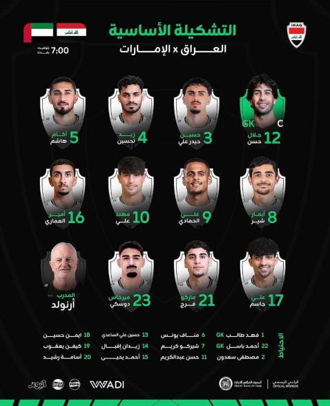 اعلن مدرب منتخبنا الوطني ارنولد عن تشكيلة اسود الرافدين لمواجه المنتخب الاماراتي مساء اليوم في ذهاب الملحق الآسيوي المؤهل الى الملحق العالمي لكأس العالم ٢٠٢٦ ./ انتهى