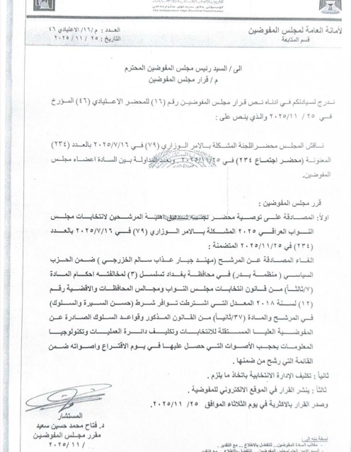 بالوثيقة ..المفوضية تقرر استبعاد احد المرشحين الفائزين عن منظمة بدر في بغداد وحجب اصواته