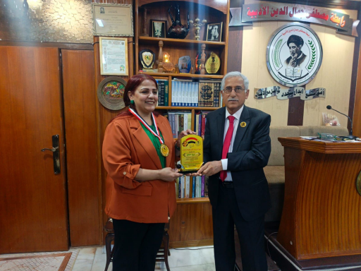 وفي ختام الجلسة تمَّ تكريم ضيفة الرابطة بشهادة مصطفى جمال الدين التقديرية قدَّمها لها الشاعر كاظم اللايذ كما قدم لها رئيس الرابطة، قلادة ودرع مصطفى جمال الدين للإبداع./ انتهى