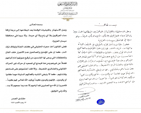 واكد الصدر في بيان رسمي حمل خطه وتوقيعه ، حول مقتل قيادي بارز في التيار الصدري في محافظة ميسان ، على منع اي تصعيد او حراك غير الحراك القانوني والعشائري المنضبط، وعدم الانجرار خلف الفتن والمخططات التي يسعى اليها الفاسدون ./ انتهى