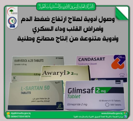 اعلنت وزارة الصحة عن وصول أدوية لعلاج ارتفاع ضغط الدم وأمراض القلب وداء السكري. وذكرت الوزارة في بيان :" ان ألادوية المتنوعة من إنتاج المصانع الوطنية، وسيتم توزيعها على دوائر الصحة في بغداد والمحافظات، وحسب الاحتياج ./ انتهى