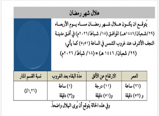 وجاء في نص التوقع الفلكي في مواقيت الأهلة عن إمكانية رؤية الهلال في أفق مدينة النجف قبل وبعد مغيب الشمس ليوم ال١٨ من شهر شباط وبالتالي سيكون يوم الخميس ال١٩ منه هو أيام شهر رمضان المبارك ./انتهى