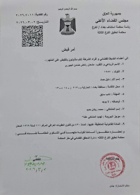 بالوثيقة .. مذكرة قبض بحق مشعان الجبوري