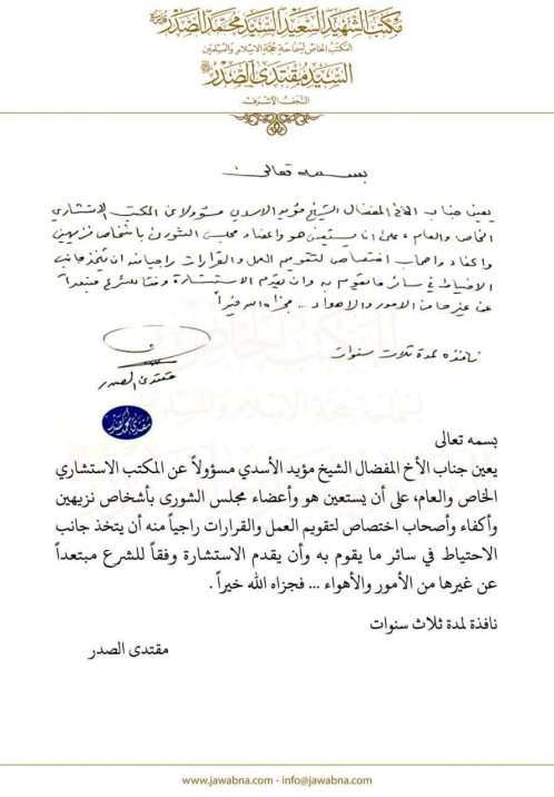 عين زعيم التيار الصدري مقتدى الصدر مؤيد الاسدي مسؤولاً عن المكتب
