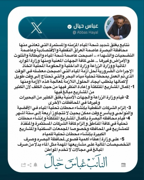 نائب: البصرة أصبحت عاصمة شح المياه والبطالة والتلوث والأمراض وغيرها