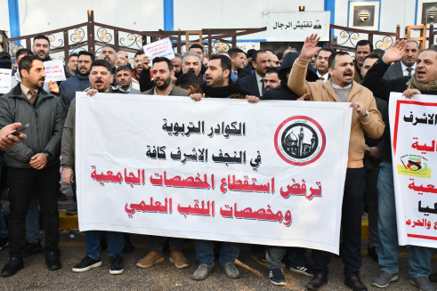 وقفة احتجاجية لحملة الماجستير في تربية النجف على قرار حجب مخصصات الخدمة الجامعية