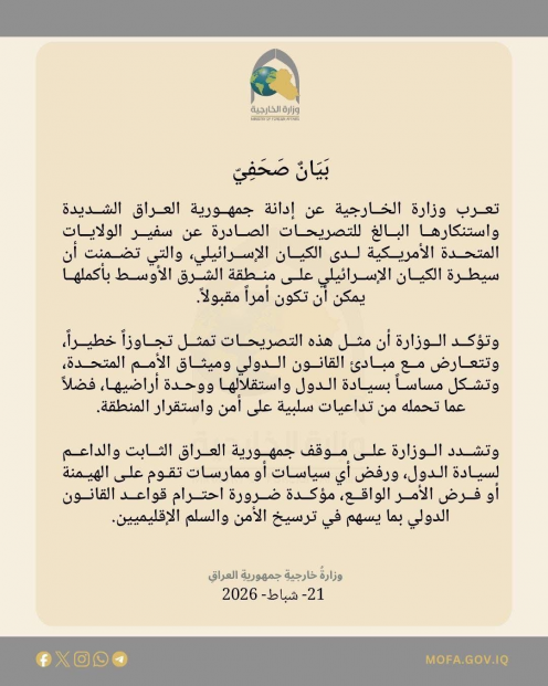 العراق يدين تصريحات للسفير الامريكي لدى الكيان الصهيوني
