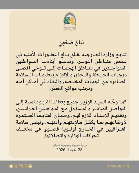 الخارجية تدعو المواطنين بمناطق الهجمات الى توخي الحذر وتجنب مواقع الخطر