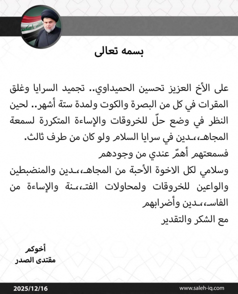 الصدر يوجّه بتجميد مقرات سرايا السلام في البصرة والكوت