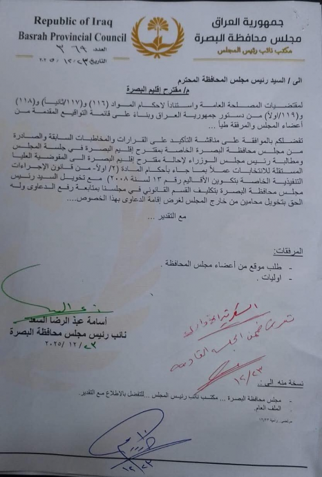 وكان عدد من أعضاء مجلس محافظة البصرة قدموا طلبا رسميا للتصويت على مقترح إقليم البصرة ./ انتهى