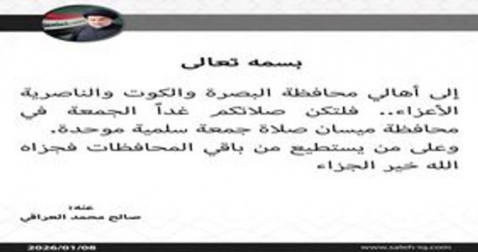 دعا زعيم التيار الصدري مقتدى الصدر ، اهالي محافظات البصرة وذي قار وميسان ، الى صلاة جمعة سلمية موحدة في ميسان./ انتهى