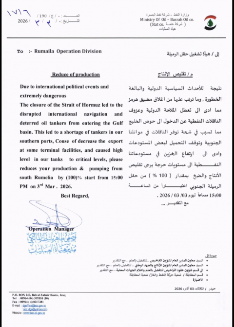 قررت وزارة النفط ، تقليص الانتاج والضخ من حقل الرميلة الجنوبي بنسبة 100% ، بسبب الاحداث التي تشهدها المنطقة .