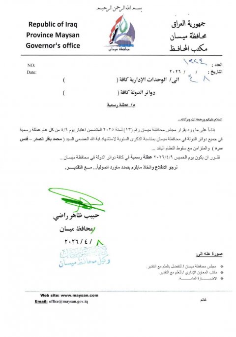 اعلن محافظ البصرة اسعد عبد الامير العيداني ، الحداد 3 أيام في المحافظة ، على أرواح الشهداء الأبرار جراء الغارة الصهيو_امريكية على منزل احد المواطنين في خور الزبير ./ انتهى